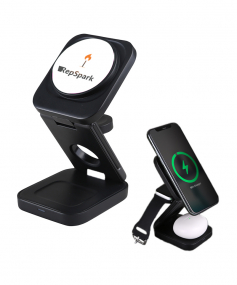 The Trifecta is your all-in-one charging solution, elegantly designed to power up your essential devices simultaneously. This versatile charging stand features a powerful 15W magnetic wireless phone charger, dedicated 5W Apple Watch charging station, and a 2.5W wireless earbuds charging pad. Perfect for hybrid work environments, the Trifecta's ingenious folding design transforms from a full charging station to a compact travel companion.